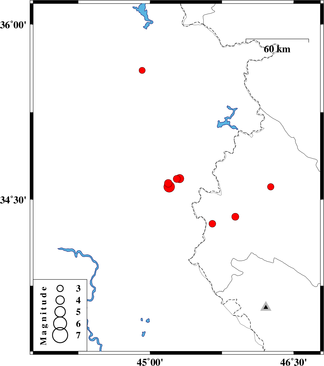 | 2021/01/29 | 14:03:22.2 | 17:33:22.2 | 34.29 | 45.65 | 10 | ML3.3 | Kermanshah Province, 26 km South of Qasr-E-Shirin | ||