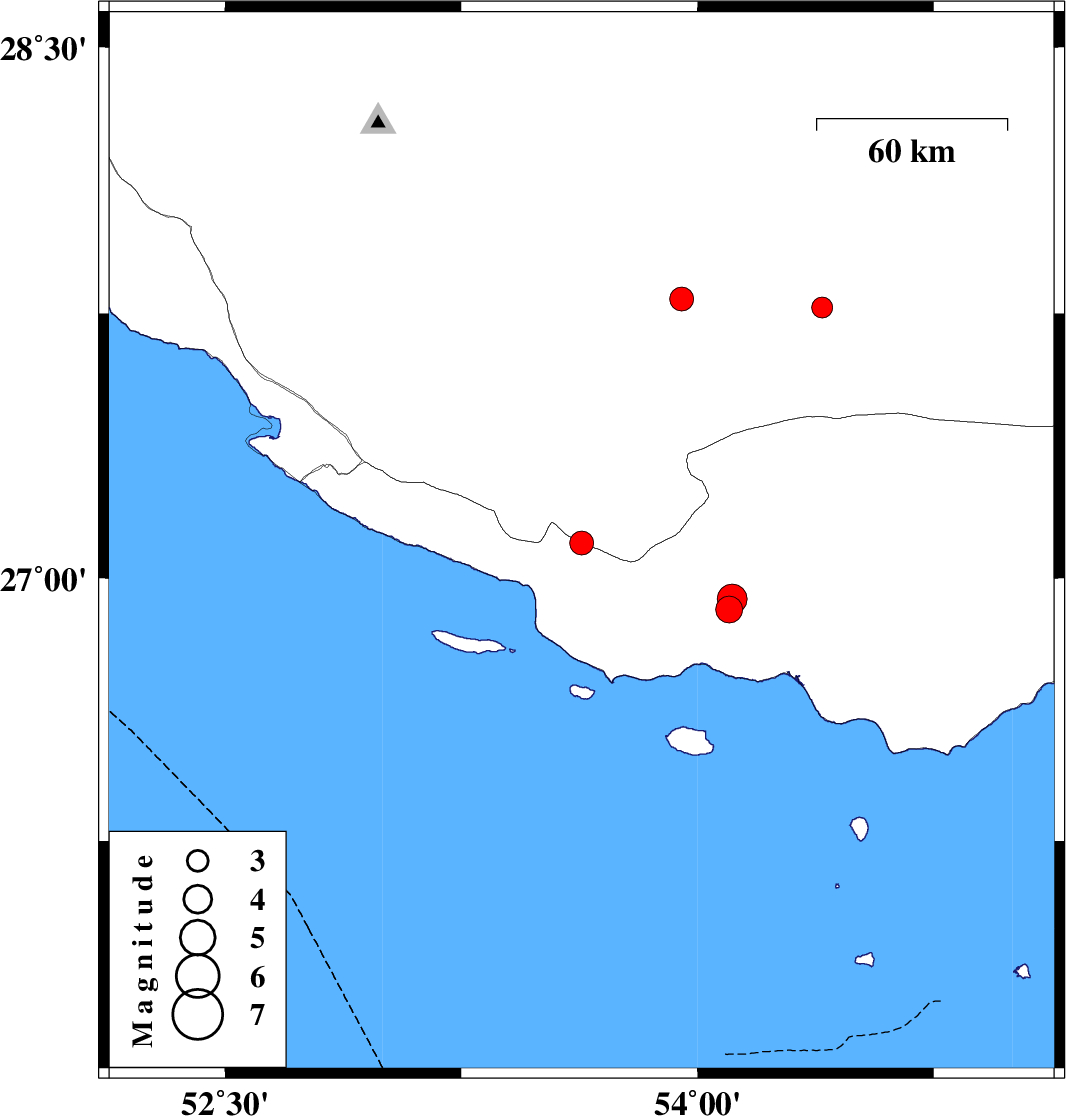 2021/02/03 | 05:59:39.5 | 09:29:39.5 | 26.91 | 54.1 | 26 | ML3.8 | Hormozgan Province, 41 km South-West of Bastak | ||