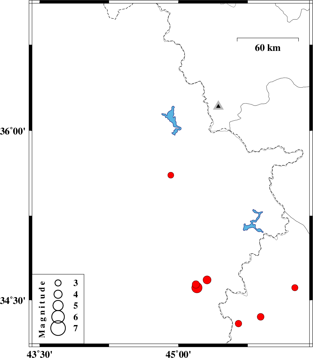 | 2021/02/12 | 05:28:29.7 | 08:58:29.7 | 34.68 | 45.31 | 25 | ML4 | Iraq, 31 km North-West of Qasr-E-Shirin | ||