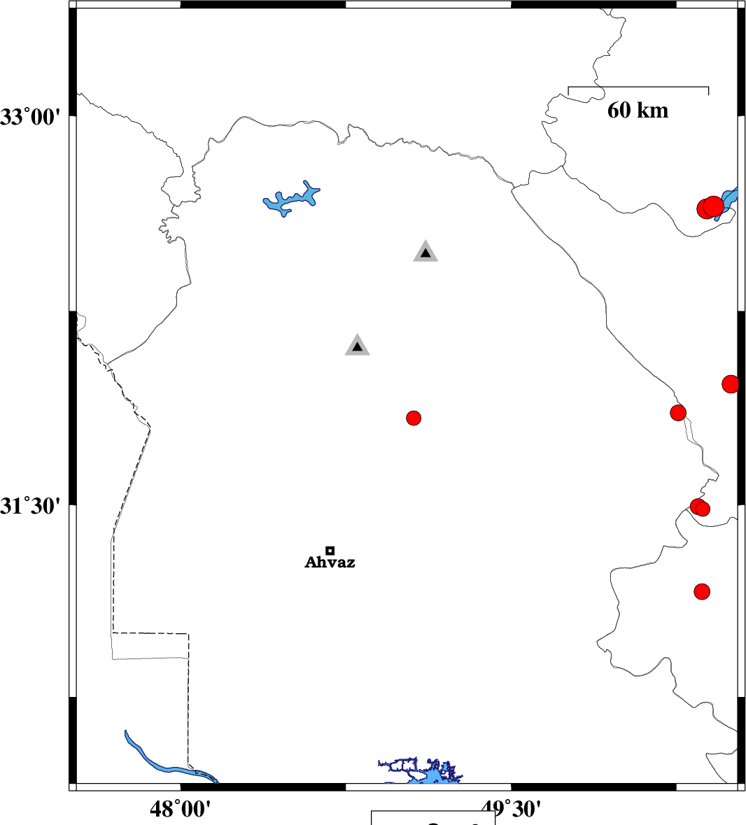 | 2021/01/24 | 08:49:11.3 | 12:19:11.3 | 32.06 | 49.33 | 10 | ML3.3 | Khoozestan Province, 14 km North of Masjed Soleyman | ||