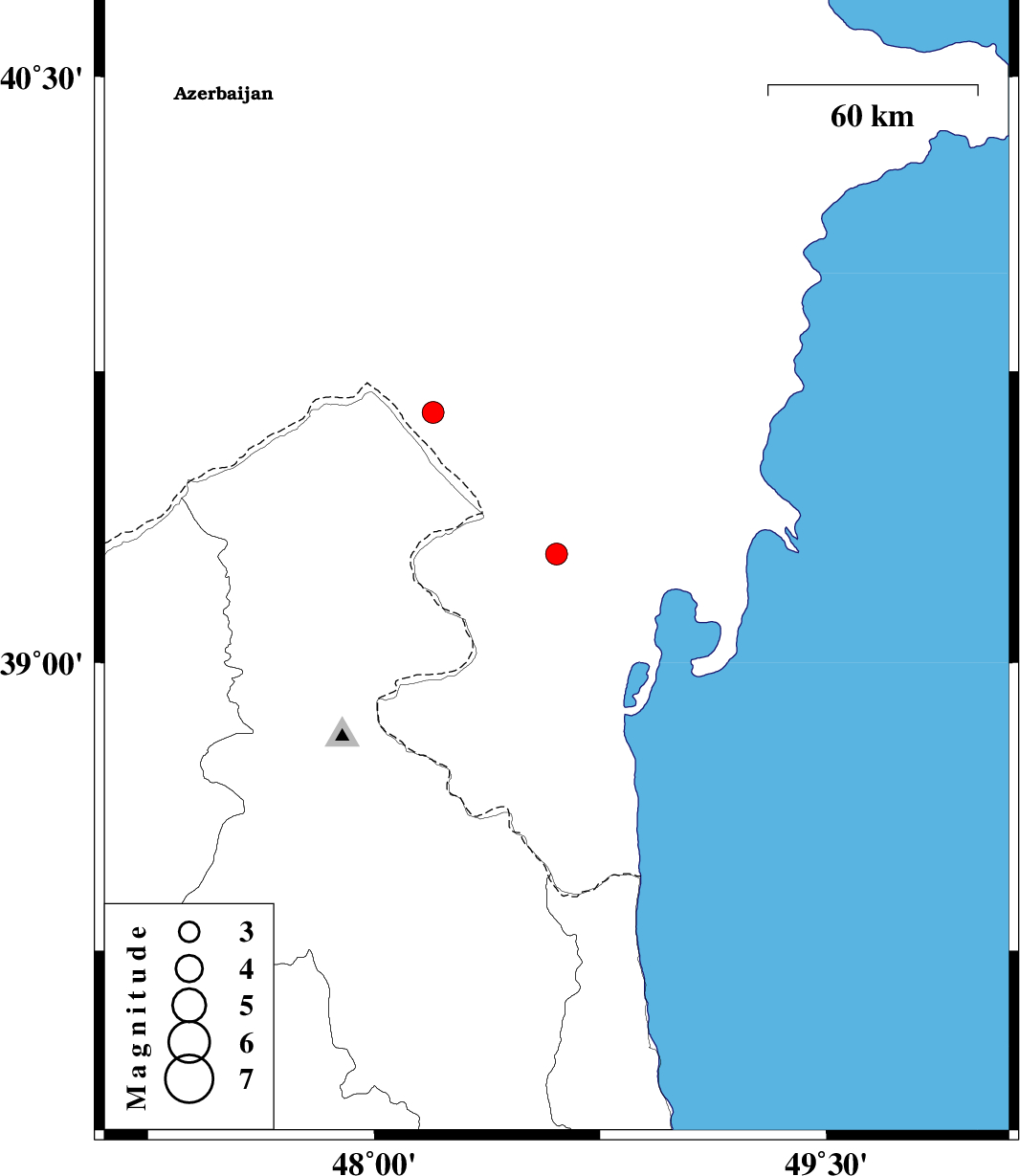 | 2020/08/28 | 07:05:06.3 | 11:35:06.3 | 39.28 | 48.605 | 12 | ML3.2 | Azerbaijan, 27 km South-East of Bileh Savar | ||