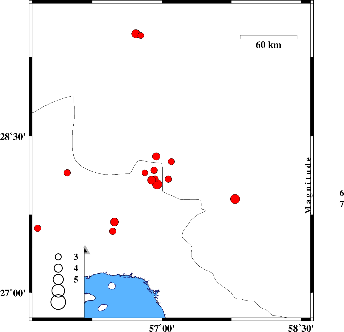 | 2020/08/21 | 14:57:10.8 | 19:27:10.8 | 28.09 | 57.07 | 10 | ML3.3 | Kerman Province, 63 km North-West of Kahnuj | ||