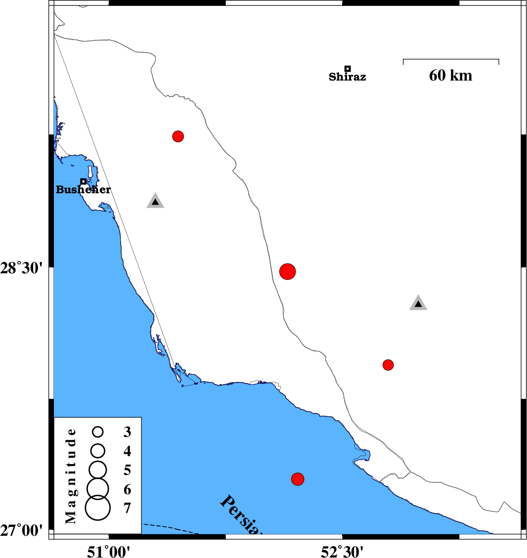 | 2024/10/09 | 04:45:41.9 | 08:15:41.9 | 27.943 | 52.793 | 12 | ML3.1 | Fars Province, 45 km North of Mehr | ||