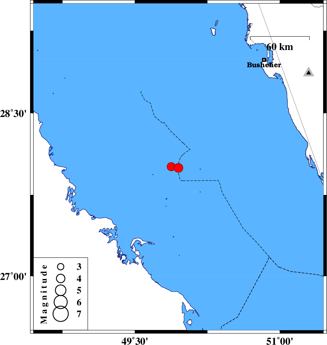 | 2024/10/29 | 23:20:44.7 | 02:50:44.7 | 28.009 | 49.875 | 12 | ML3.9 | Persian Gulf |