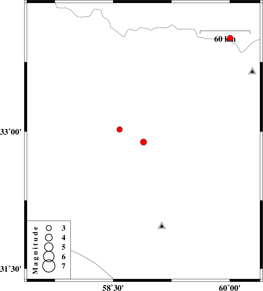 2024/11/13 | 05:57:32.6 | 09:27:32.6 | 33.022 | 58.583 | 12 | ML:3.3 | Khorasan(south) Province, 62 km North-West of Birjand | ||