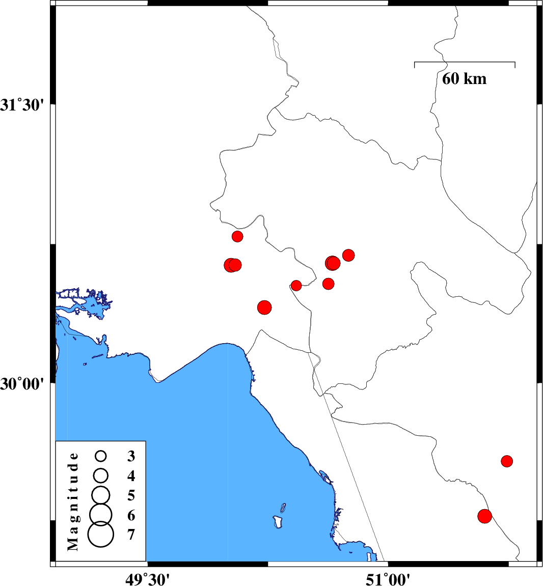 | 2024/11/08 | 04:01:46.4 | 07:31:46.4 | 30.791 | 50.059 | 10 | ML3.1 | Khoozestan Province, 28 km North-West of Behbahan | ||
