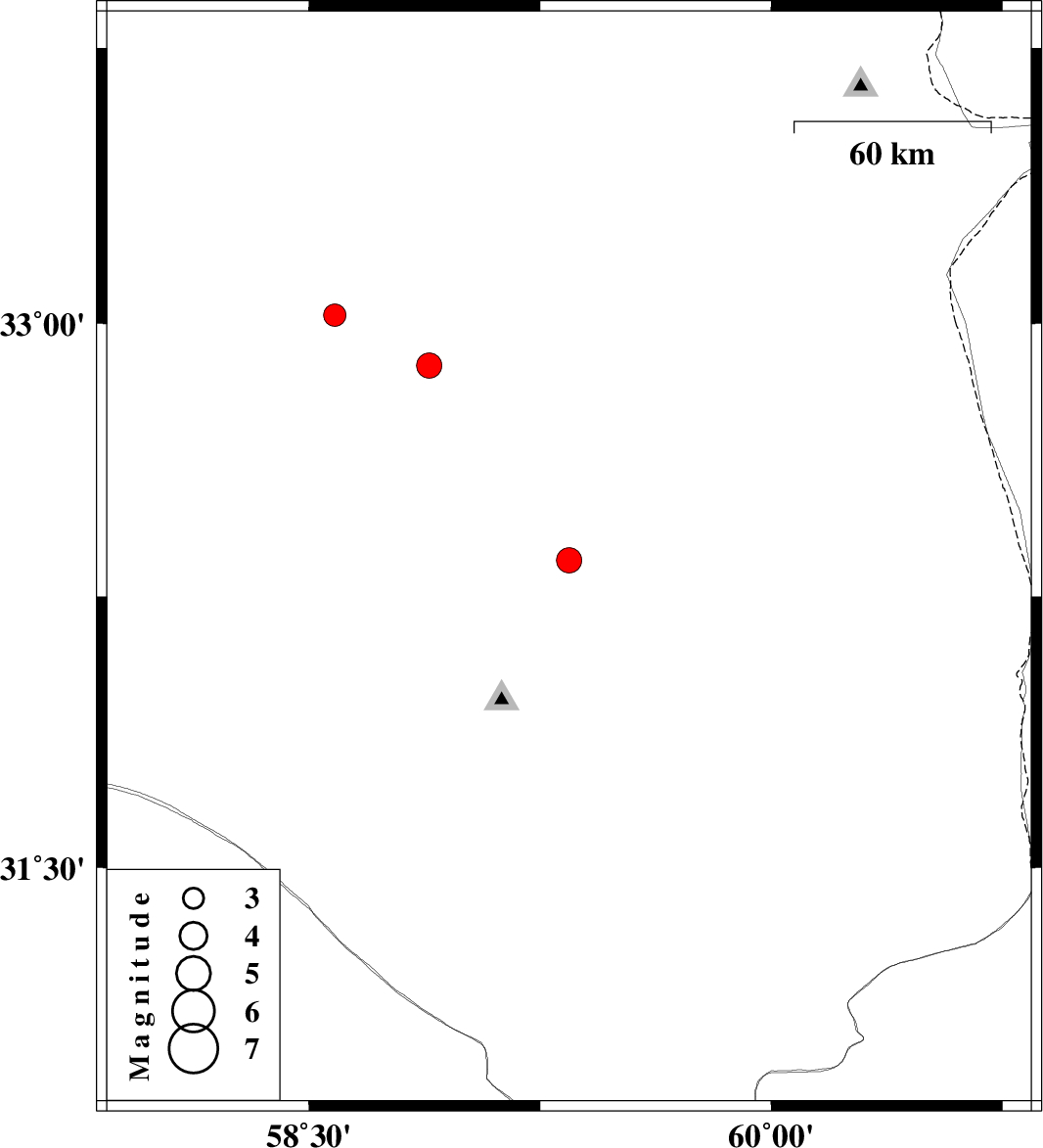 2024/11/13 | 05:57:32.6 | 09:27:32.6 | 33.022 | 58.583 | 12 | ML:3.3 | Khorasan(south) Province, 62 km North-West of Birjand |