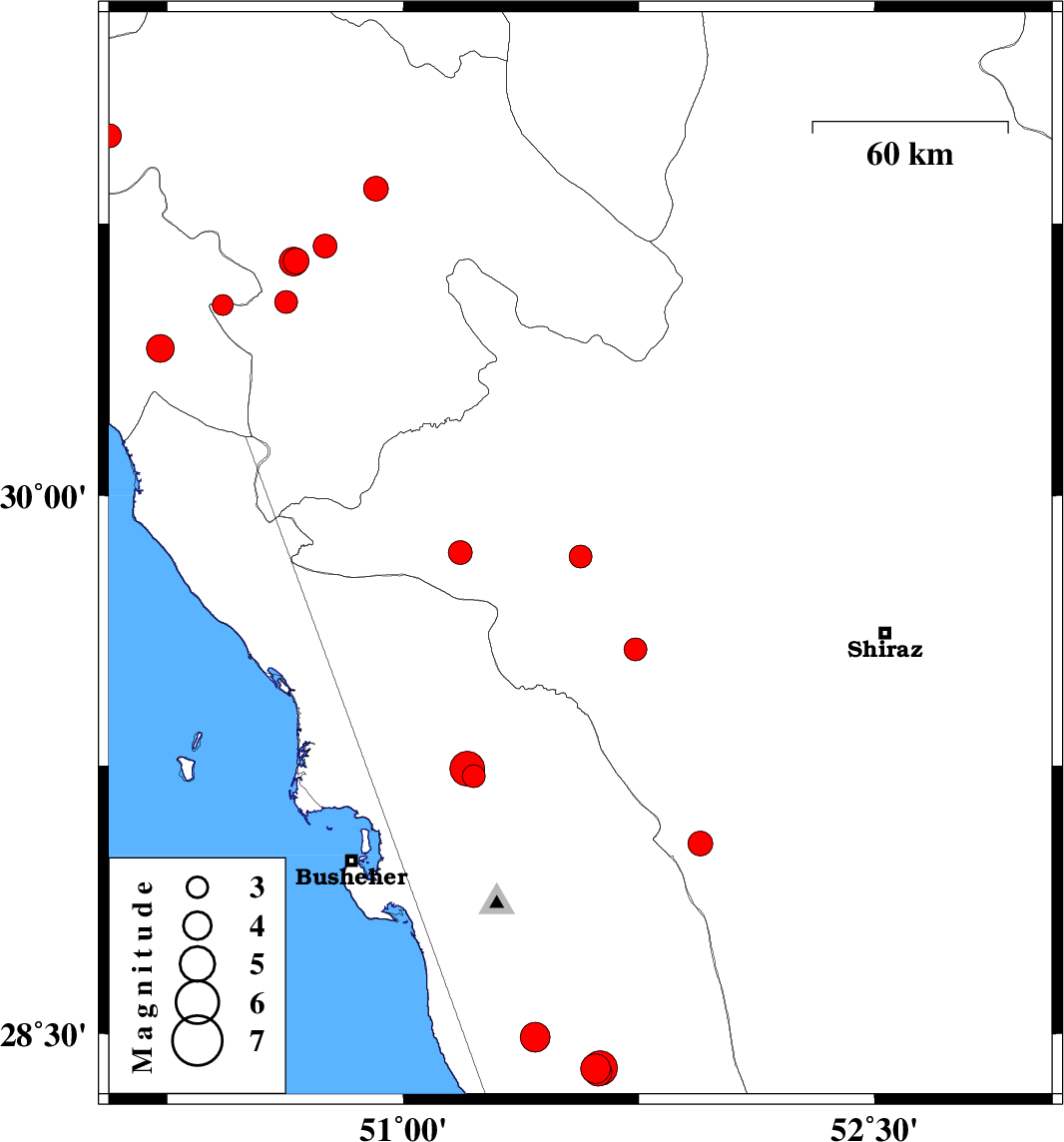 | 2024/12/05 | 13:42:23.7 | 17:12:23.7 | 28.489 | 51.419 | 12 | ML4.2 | Bushehr Province, 19 km South of Khormog | ||