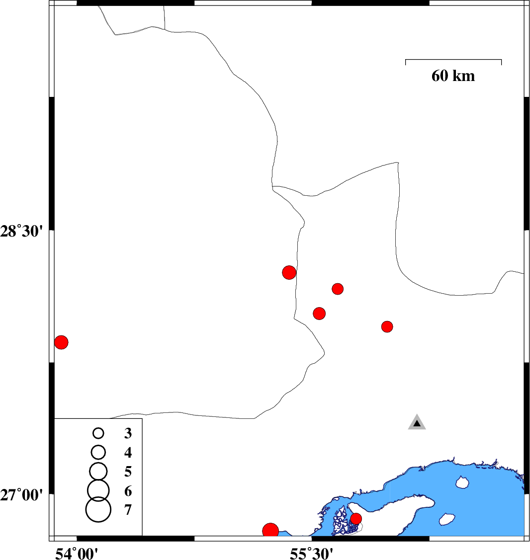 | 2024/11/28 | 05:43:10.5 | 09:13:10.5 | 27.865 | 53.9 | 12 | ML3.9 | Fars Province, 48 km North-West of Lar |
