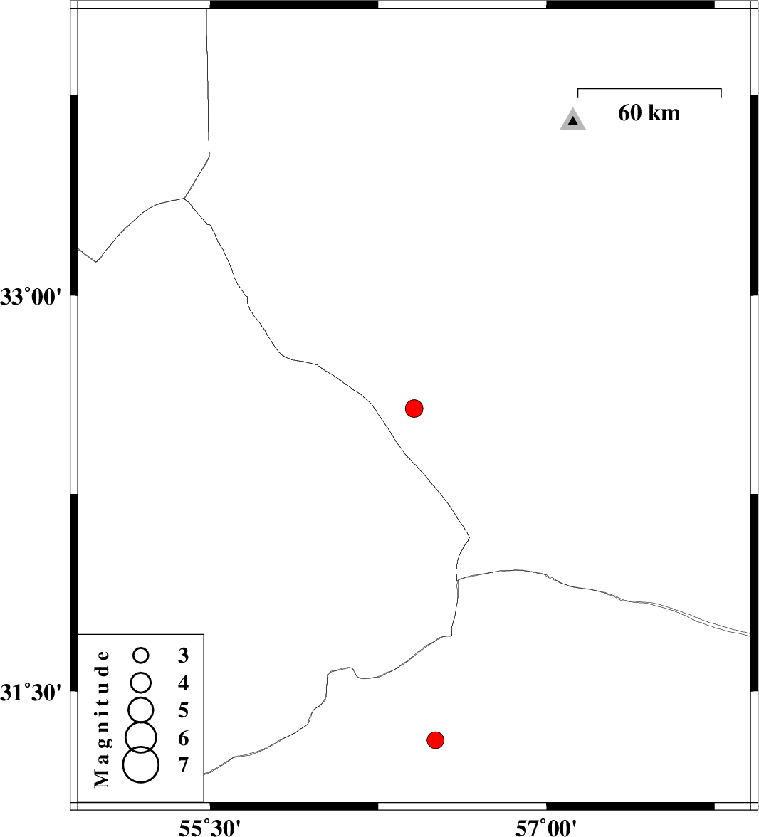 | 2025/01/04 | 01:58:19.3 | 05:28:19.3 | 32.573 | 56.41 | 17 | ML3.5 | Yazd Province, 124 km South-West of Tabas | ||
