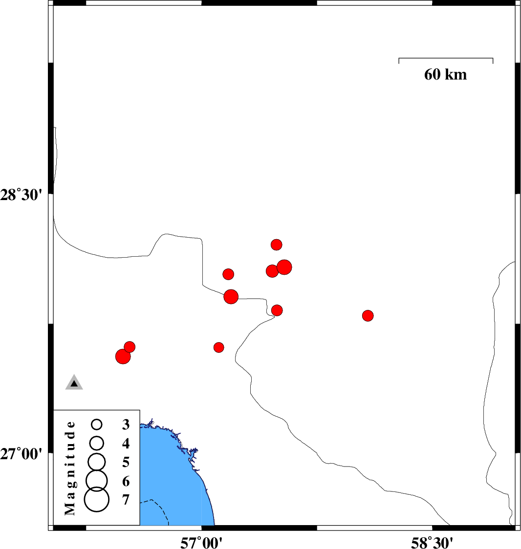 | 2025/01/06 | 03:54:16.8 | 07:24:16.8 | 28.077 | 57.537 | 10 | ML4.4 | Kerman Province, 21 km North-West of Kahnuj | ||