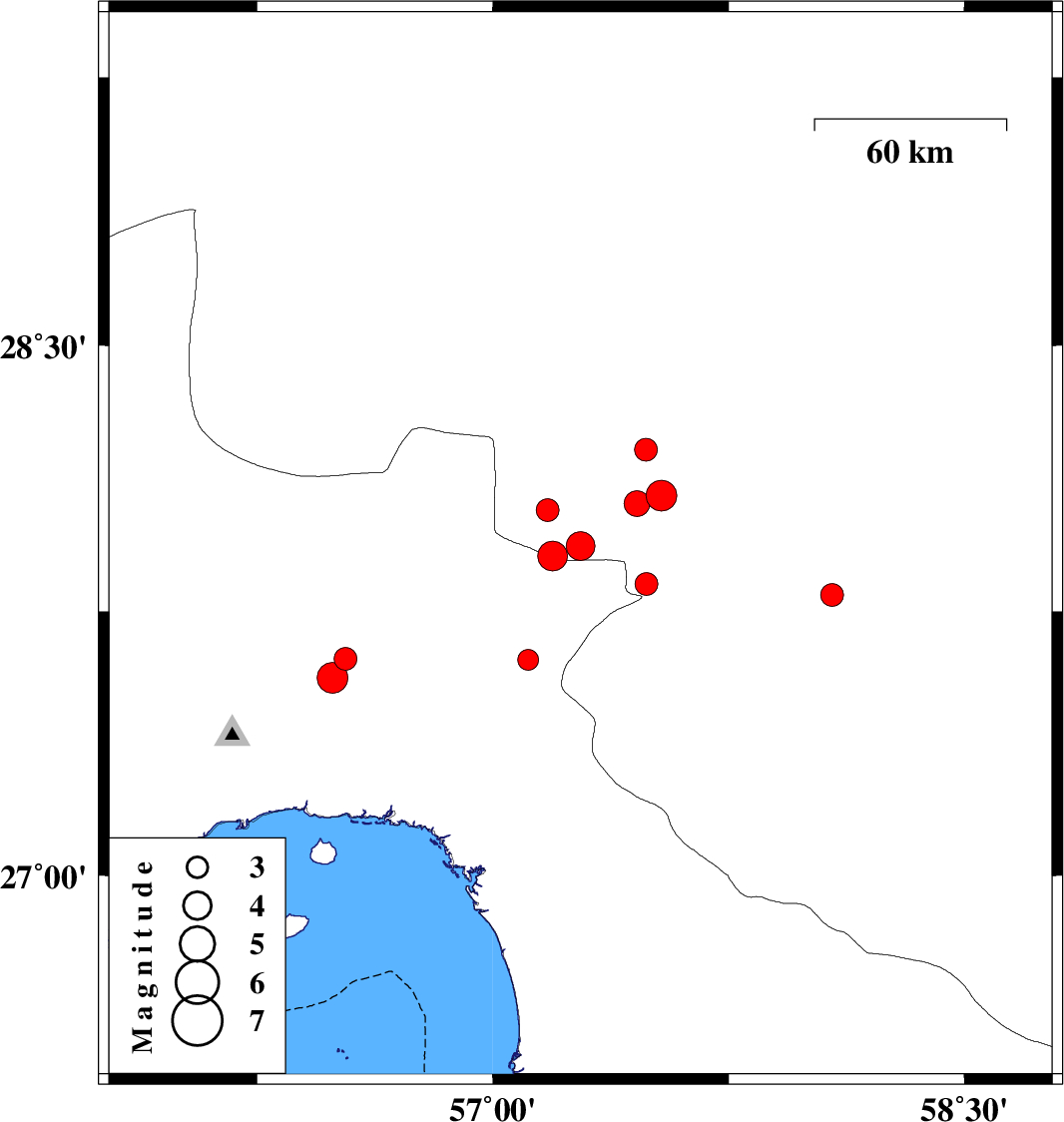 | 2024/12/18 | 23:07:56.2 | 02:37:56.2 | 27.828 | 57.489 | 12 | ML3.2 | Kerman Province, 24 km South-West of Kahnuj | ||