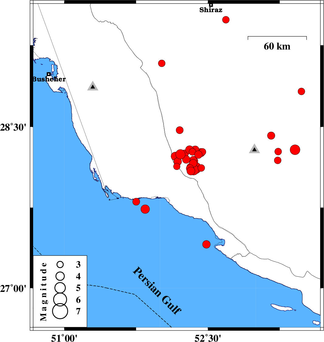 | 2025/01/06 | 17:23:49.1 | 20:53:49.1 | 28.287 | 53.41 | 10 | ML4.7 | Fars Province, 28 km South-West of Jahrom | ||