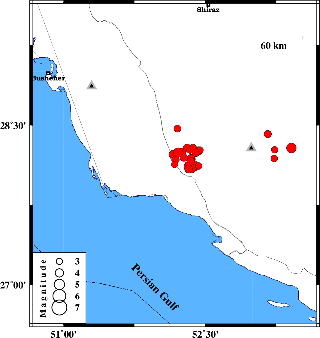| 2025/01/06 | 17:23:49.1 | 20:53:49.1 | 28.287 | 53.41 | 10 | ML4.7 | Fars Province, 28 km South-West of Jahrom | ||