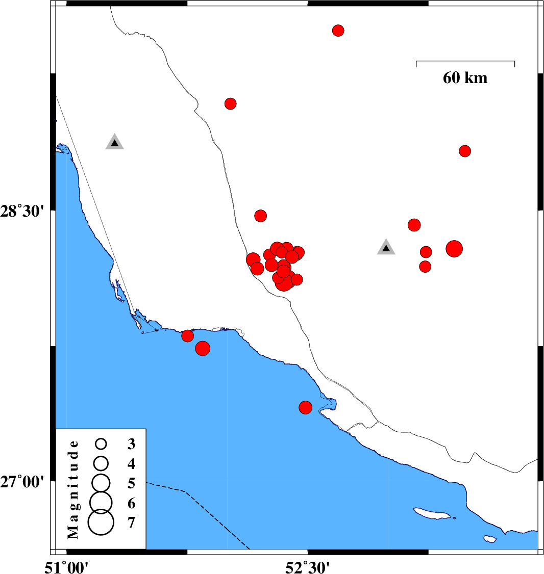 | 2024/12/23 | 06:31:51.5 | 10:01:51.5 | 27.408 | 52.485 | 20 | ML3.7 | Persian Gulf, 43 km South-West of Mehr | ||