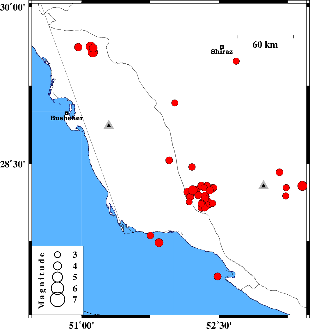 | 2025/01/16 | 22:02:01.2 | 01:32:01.2 | 29.608 | 51.128 | 12 | ML3.9 | Bushehr Province, 39 km North of Borazjan | ||