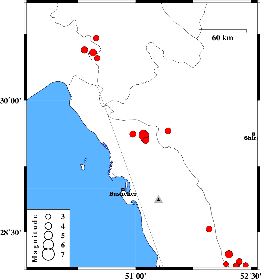 | 2025/01/16 | 19:20:52.1 | 22:50:52.1 | 29.568 | 51.123 | 12 | ML4.8 | Bushehr Province, 35 km North of Borazjan | ||