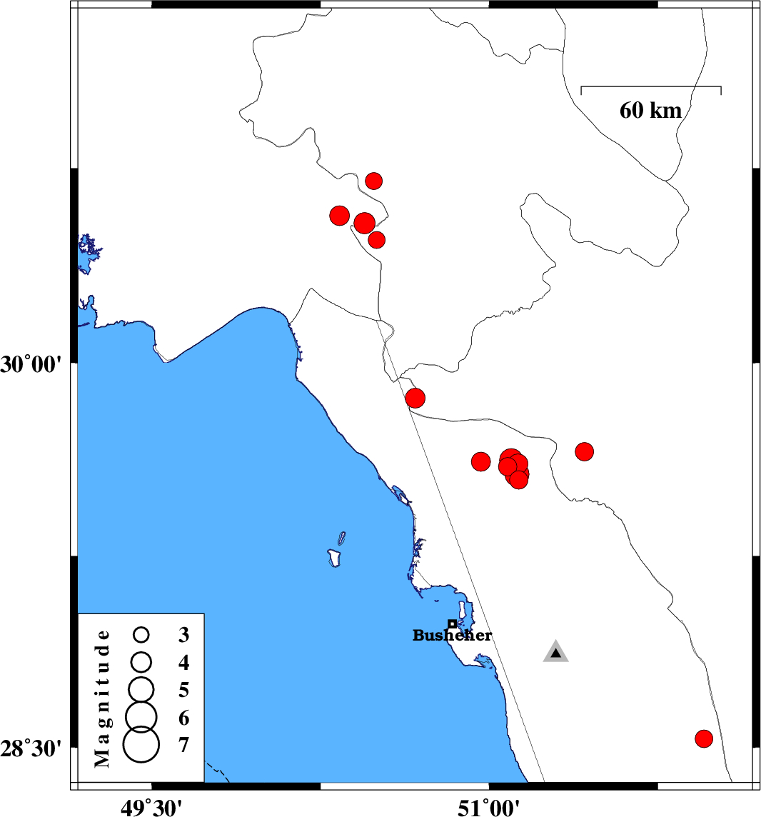 | 2025/01/17 | 00:10:11.6 | 03:40:11.6 | 29.597 | 51.083 | 12 | ML3.7 | Bushehr Province, 39 km North-West of Borazjan | ||