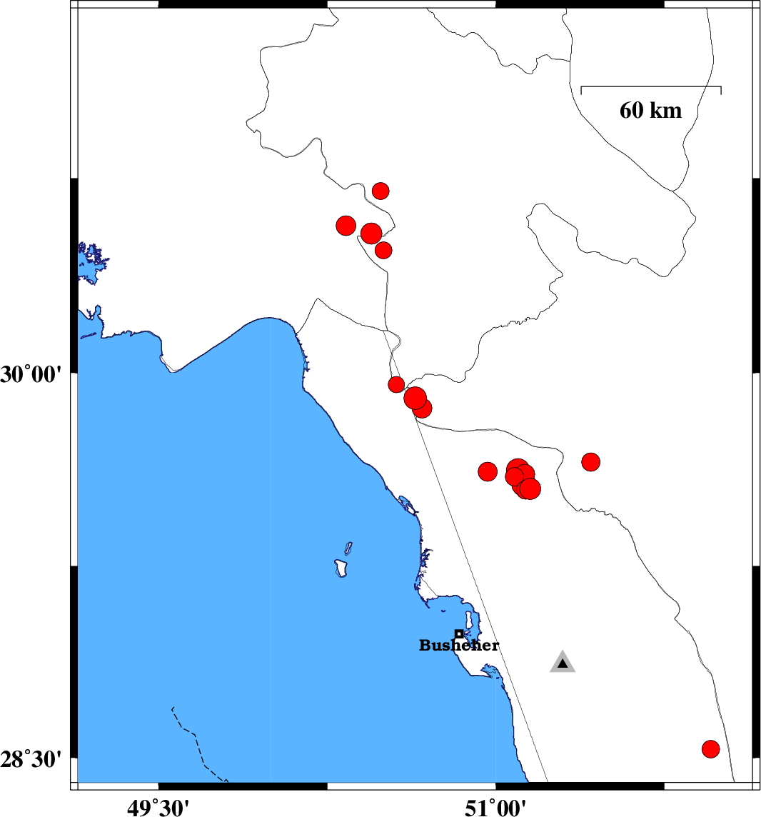 | 2025/01/19 | 07:30:13.8 | 11:00:13.8 | 29.55 | 51.153 | 12 | ML4.2 | Bushehr Province, 32 km North of Borazjan | ||