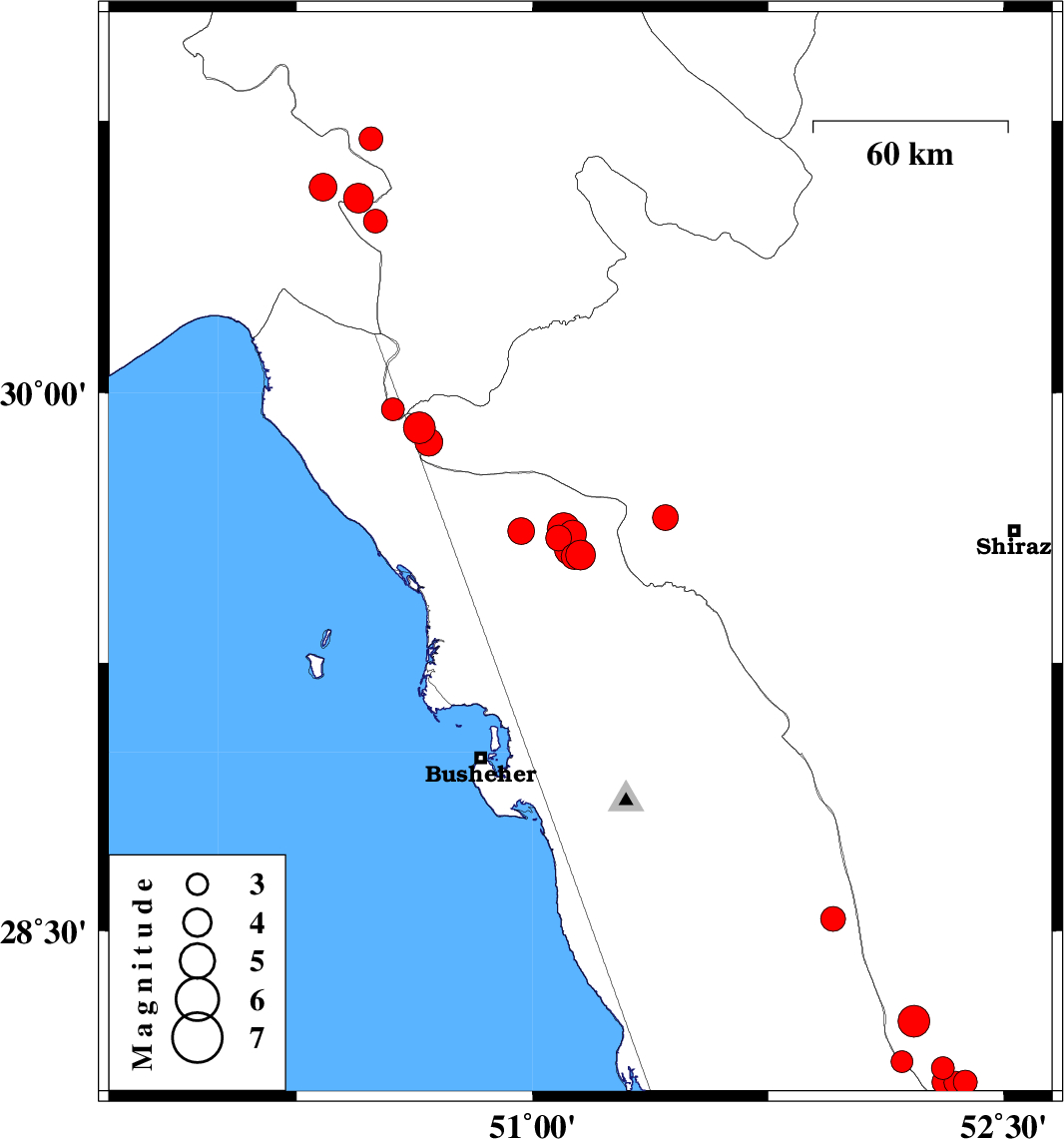 | 2025/01/16 | 22:02:01.2 | 01:32:01.2 | 29.608 | 51.128 | 12 | ML3.9 | Bushehr Province, 39 km North of Borazjan | ||