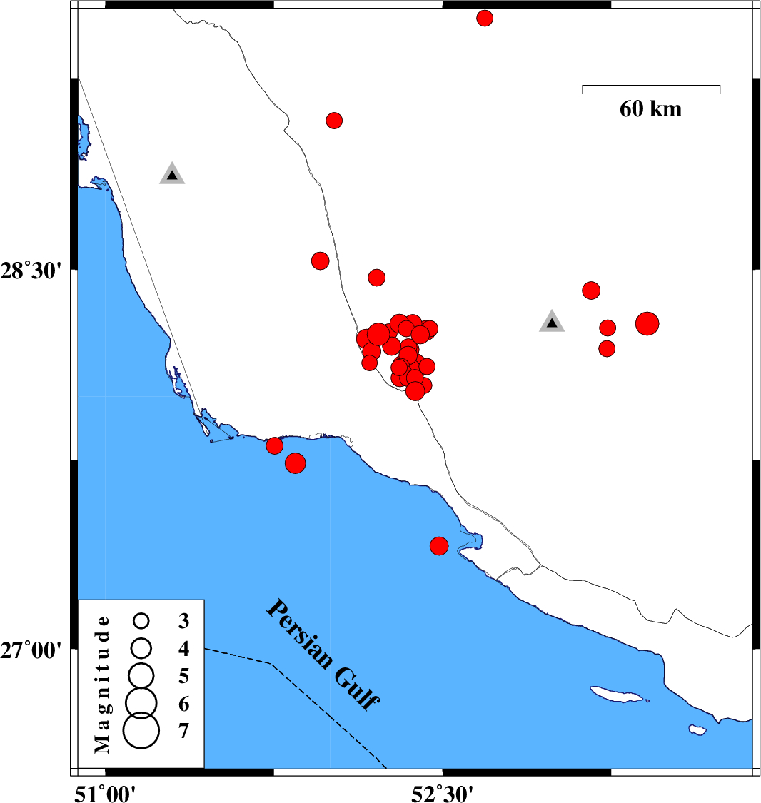 | 2024/12/23 | 06:31:51.5 | 10:01:51.5 | 27.408 | 52.485 | 20 | ML3.7 | Persian Gulf, 43 km South-West of Mehr | ||