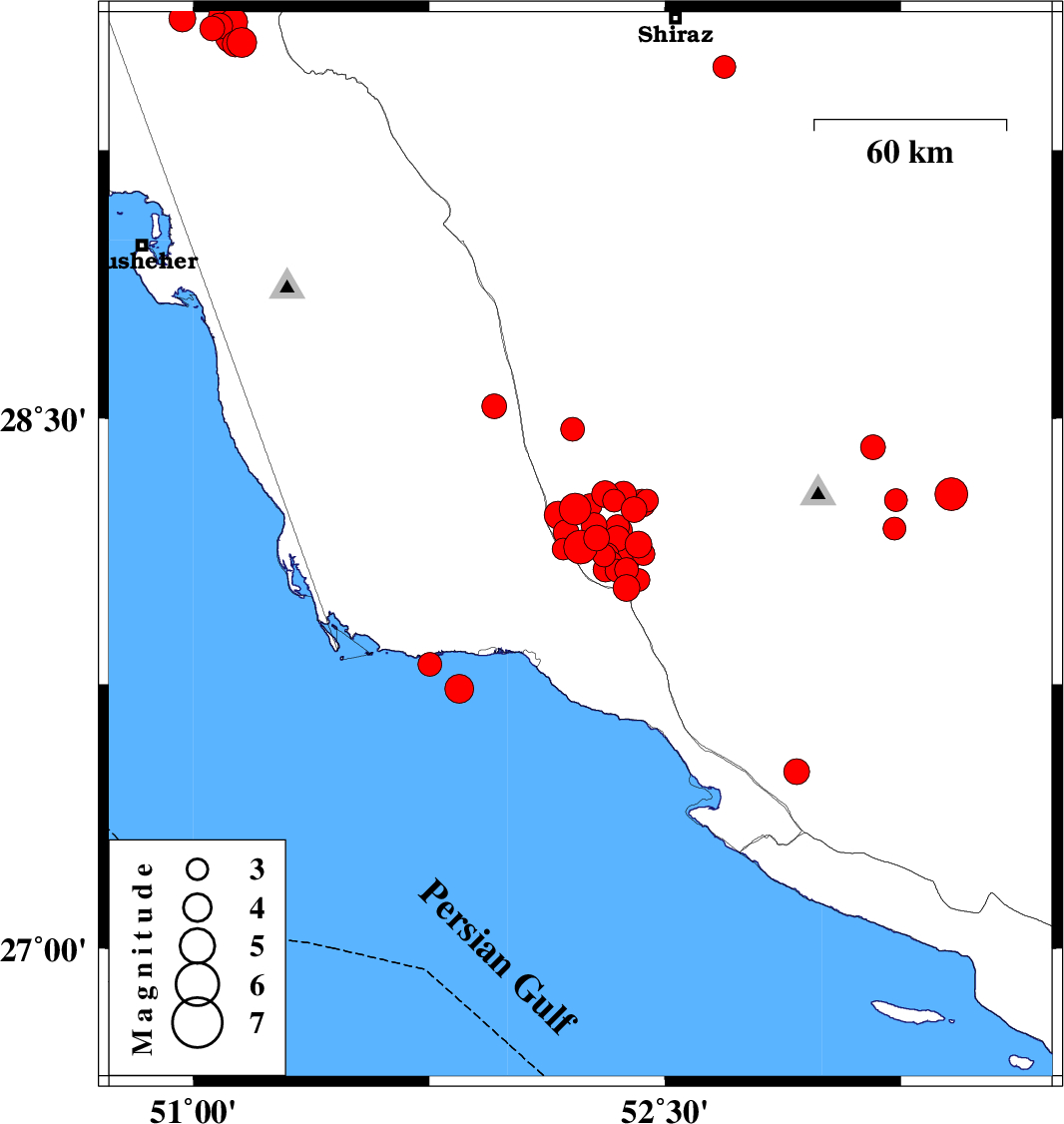 | 2025/01/16 | 22:02:01.2 | 01:32:01.2 | 29.608 | 51.128 | 12 | ML3.9 | Bushehr Province, 39 km North of Borazjan | ||