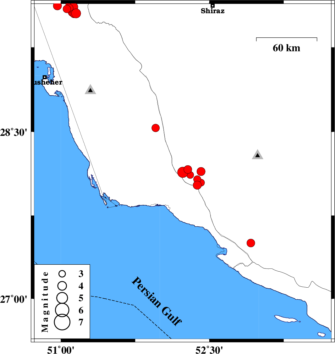 | 2025/01/16 | 22:02:01.2 | 01:32:01.2 | 29.608 | 51.128 | 12 | ML3.9 | Bushehr Province, 39 km North of Borazjan | ||