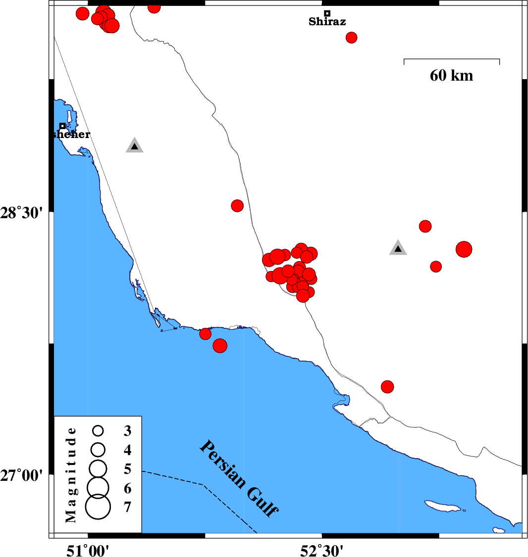 | 2025/01/17 | 00:10:11.6 | 03:40:11.6 | 29.597 | 51.083 | 12 | ML3.7 | Bushehr Province, 39 km North-West of Borazjan | ||