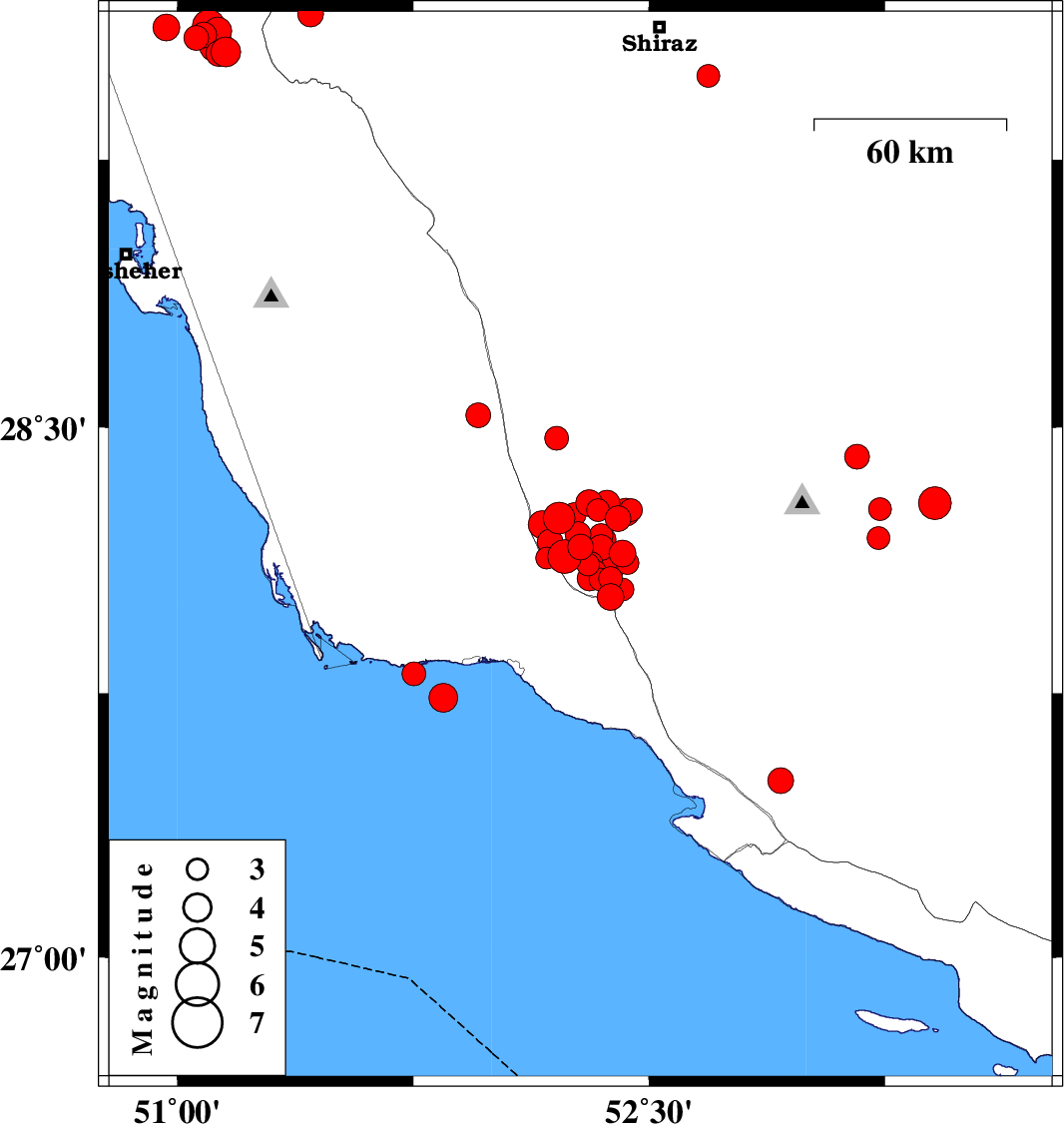 | 2025/01/16 | 22:02:01.2 | 01:32:01.2 | 29.608 | 51.128 | 12 | ML3.9 | Bushehr Province, 39 km North of Borazjan | ||