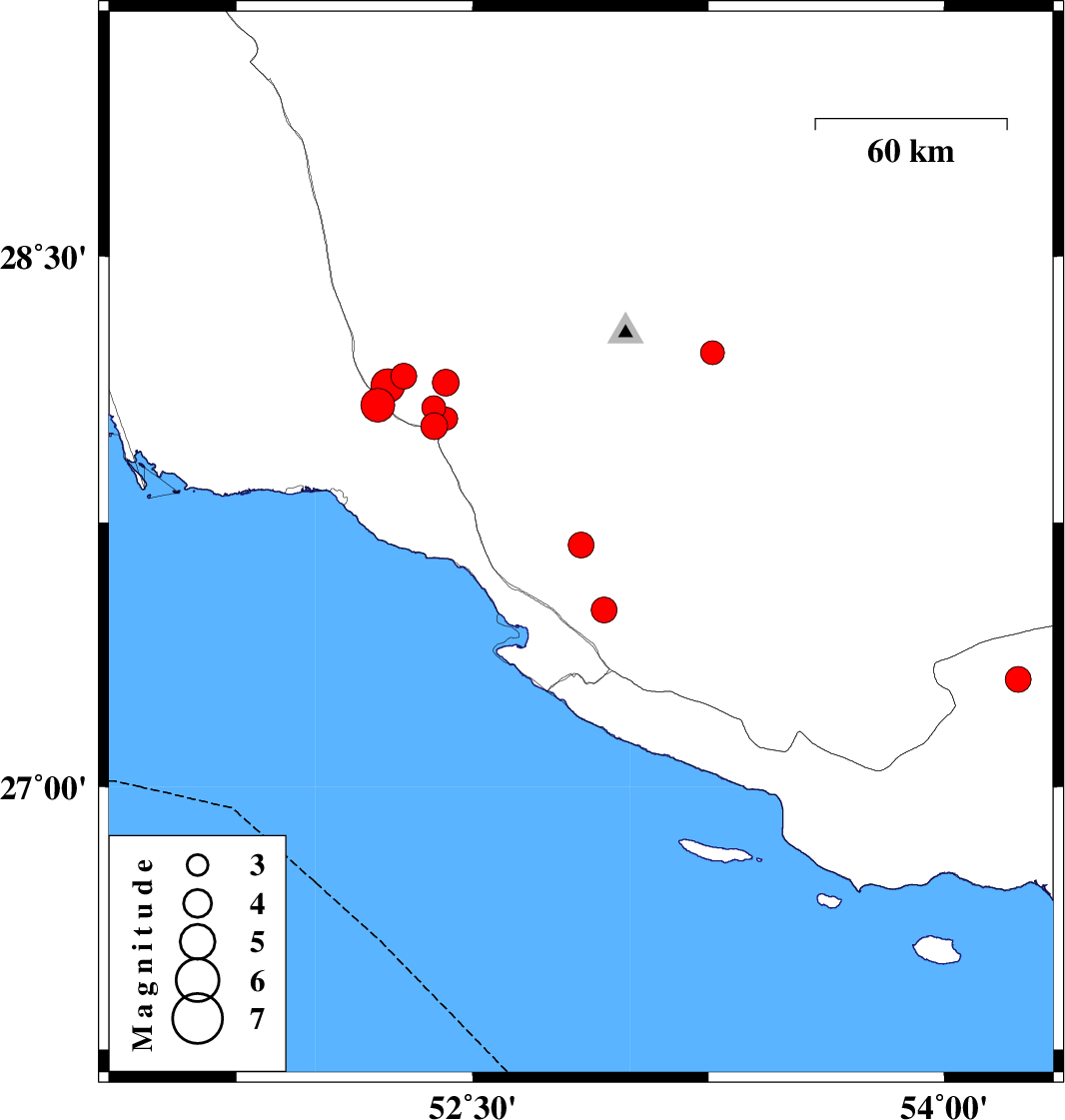 | 2025/01/25 | 02:39:11.6 | 06:09:11.6 | 27.687 | 52.845 | 10 | ML3.6 | Fars Province, 16 km North of Mehr | ||