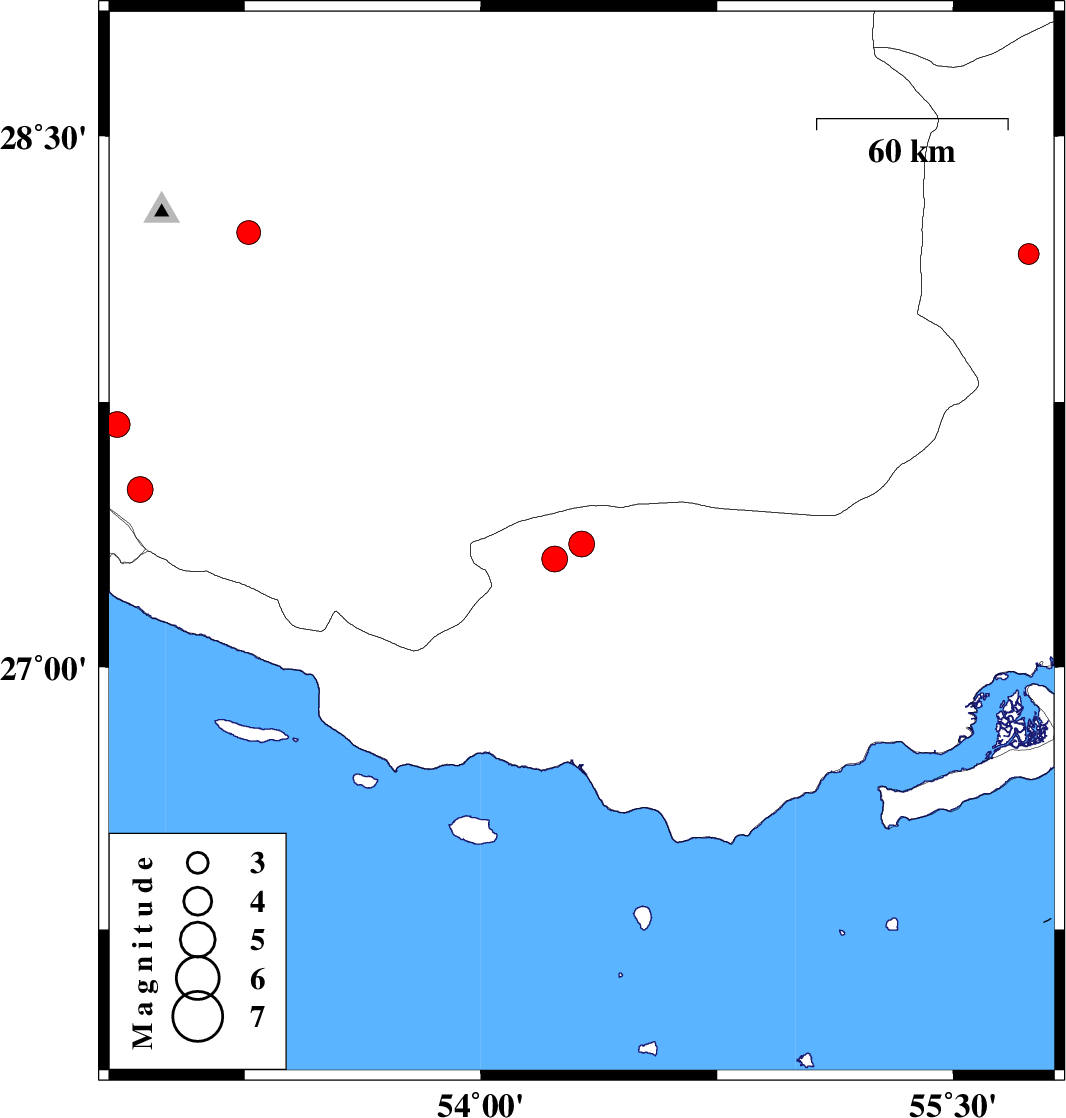 | 2025/01/26 | 00:13:30.9 | 03:43:30.9 | 27.349 | 54.32 | 31 | ML3.6 | Hormozgan Province, 17 km North of Bastak | ||