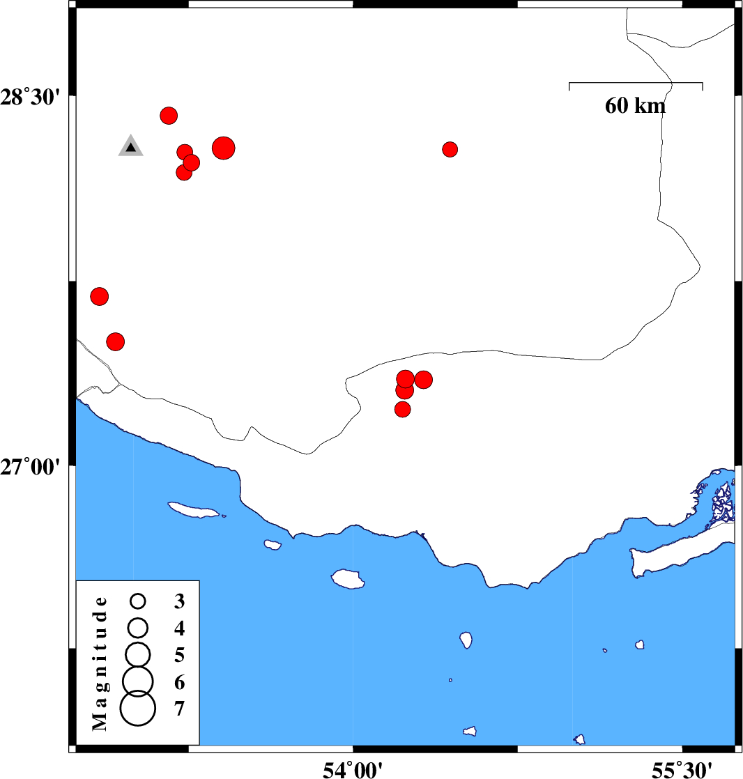 | 2025/01/07 | 13:33:41.1 | 17:03:41.1 | 28.27 | 53.234 | 12 | ML3.3 | Fars Province, 29 km South-East of Qir va Karzin | ||