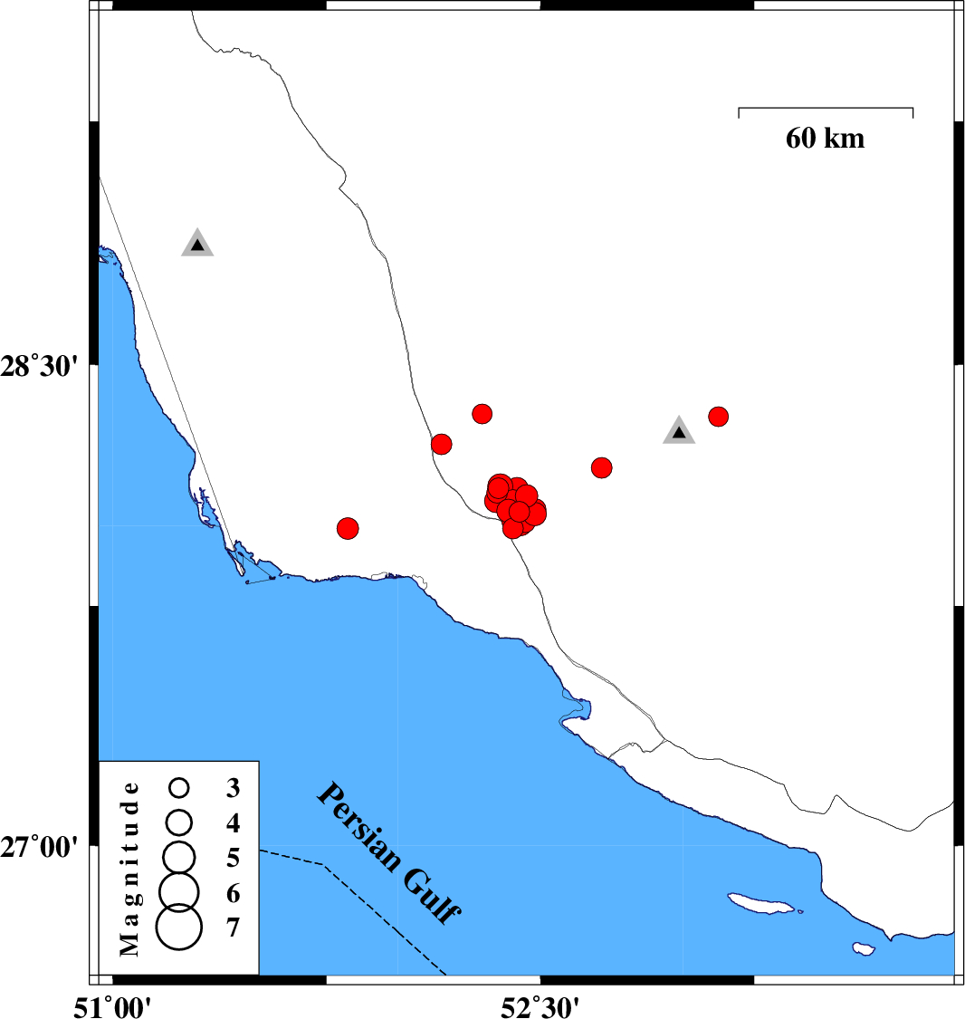 | 2025/01/30 | 06:06:46.2 | 09:36:46.2 | 27.991 | 51.824 | 12 | ML3.4 | Bushehr Province, 30 km North-West of Bandar-e kangan |