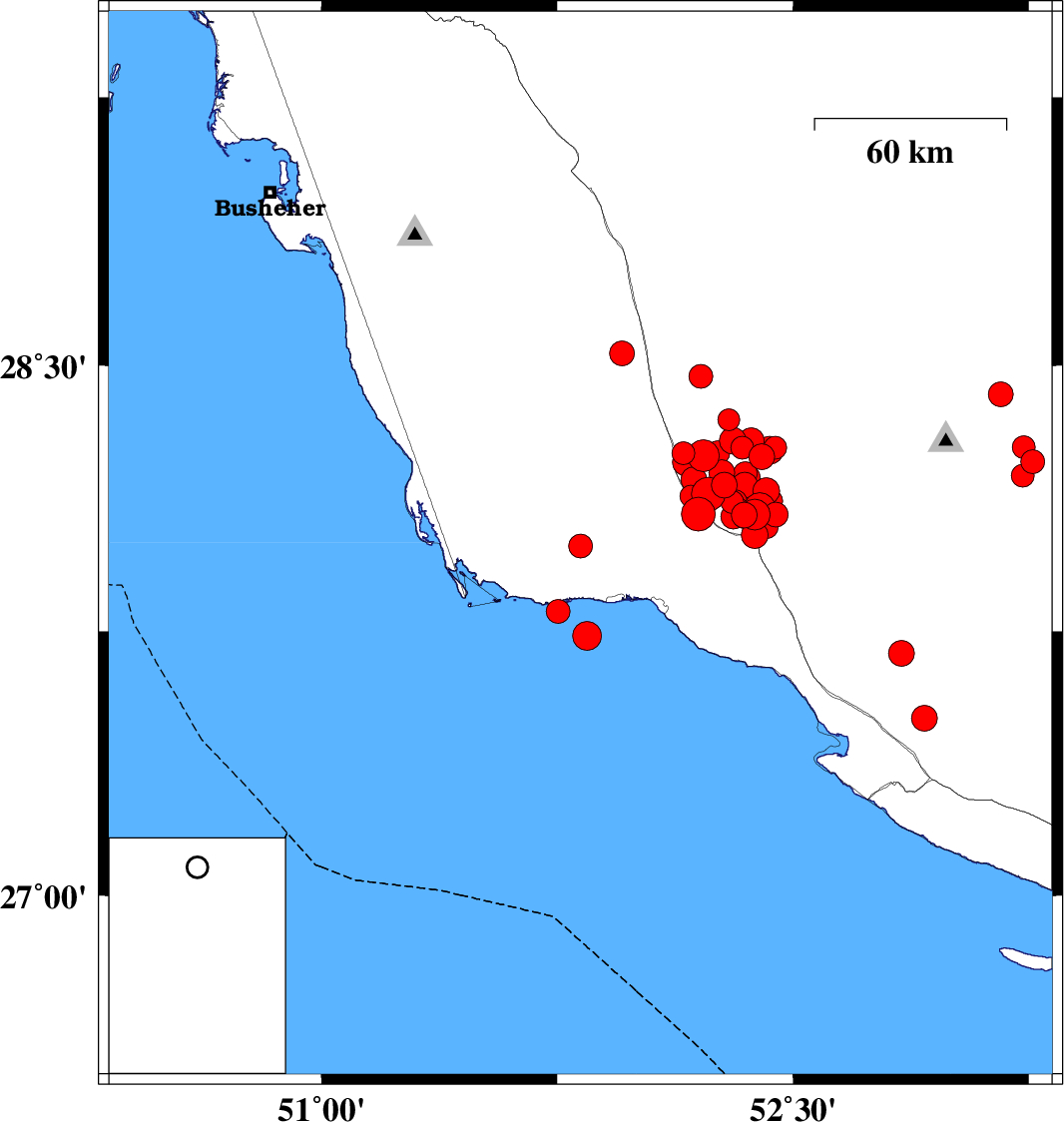 | 2025/01/04 | 21:42:37.2 | 01:12:37.2 | 27.737 | 51.845 | 37 | ML4.1 | Persian Gulf, 23 km -West of Bandar-e kangan | ||