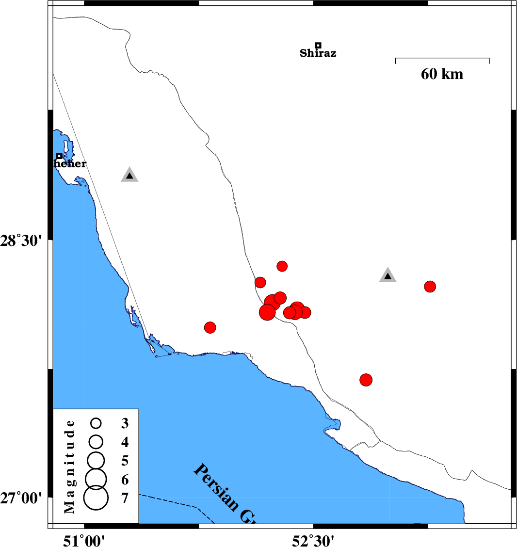 2025/01/30 12:51:05.7 16:21:05.7 28.0852.37912 ML4.4 Fars Province, 28 km North of Jam