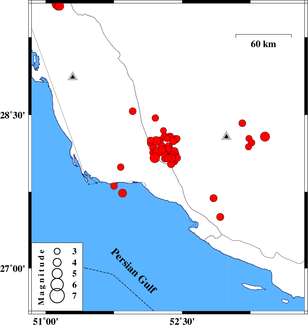 | 2025/01/30 | 06:06:46.2 | 09:36:46.2 | 27.991 | 51.824 | 12 | ML3.4 | Bushehr Province, 30 km North-West of Bandar-e kangan | ||