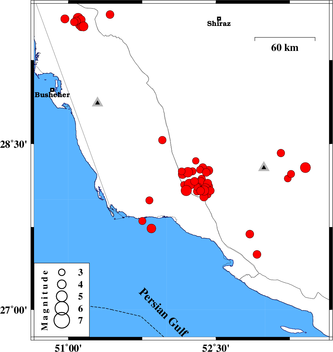 | 2025/01/17 | 00:10:11.6 | 03:40:11.6 | 29.597 | 51.083 | 12 | ML3.7 | Bushehr Province, 39 km North-West of Borazjan | ||