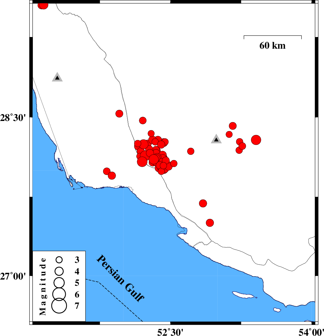 | 2025/02/04 | 15:29:33.1 | 18:59:33.1 | 27.95 | 51.877 | 12 | ML3.7 | Bushehr Province, 23 km North-West of Bandar-e kangan | ||