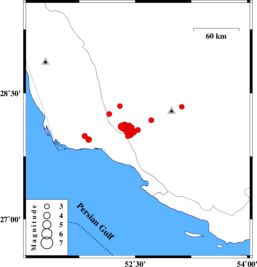 | 2025/01/30 | 06:06:46.2 | 09:36:46.2 | 27.991 | 51.824 | 12 | ML3.4 | Bushehr Province, 30 km North-West of Bandar-e kangan |