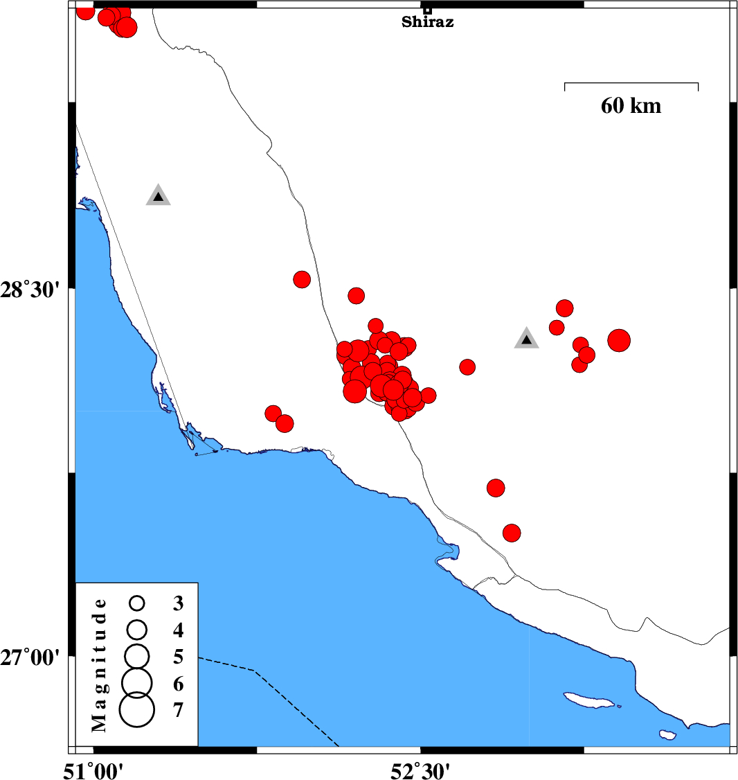 | 2025/01/16 | 22:02:01.2 | 01:32:01.2 | 29.608 | 51.128 | 12 | ML3.9 | Bushehr Province, 39 km North of Borazjan | ||