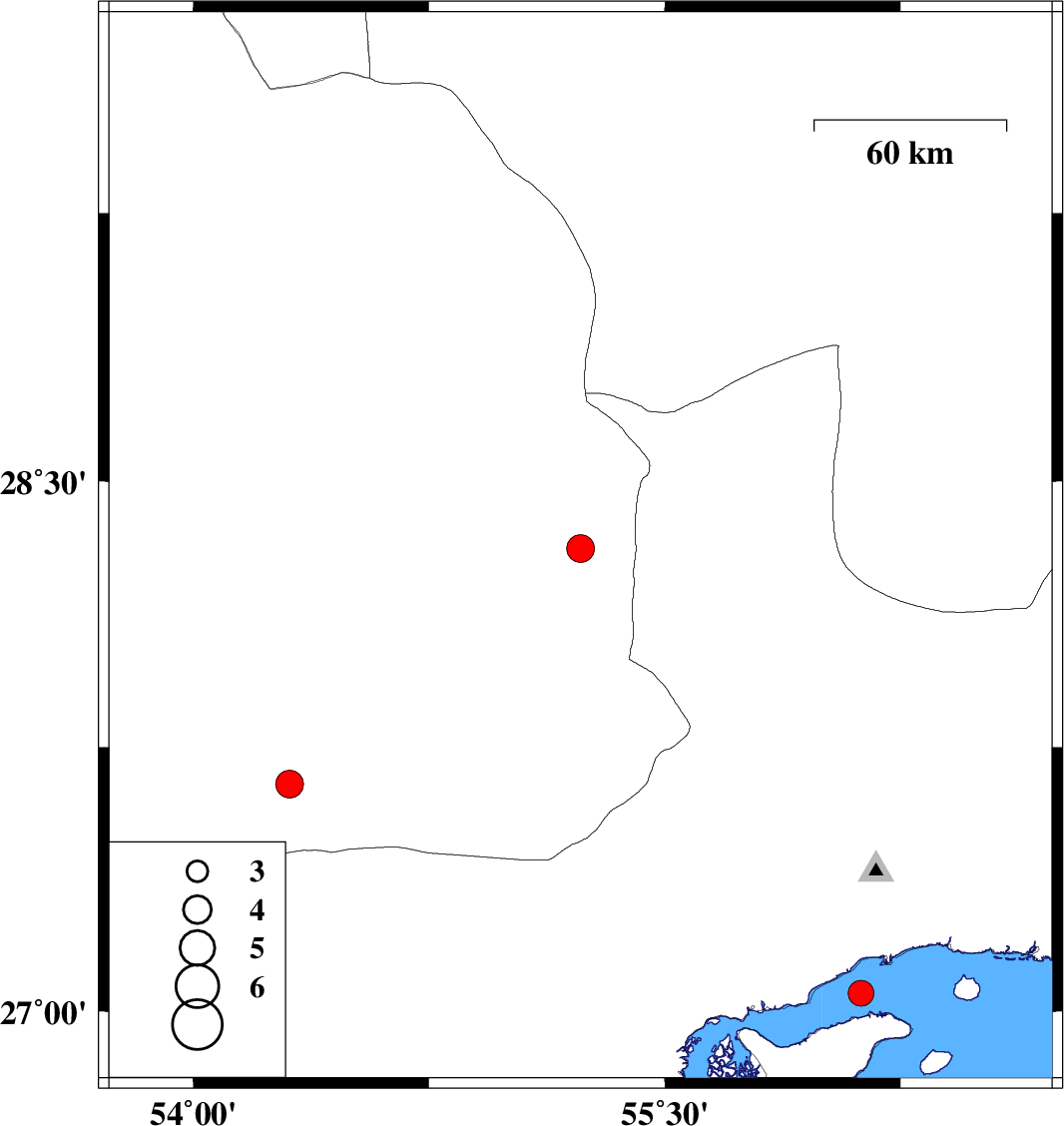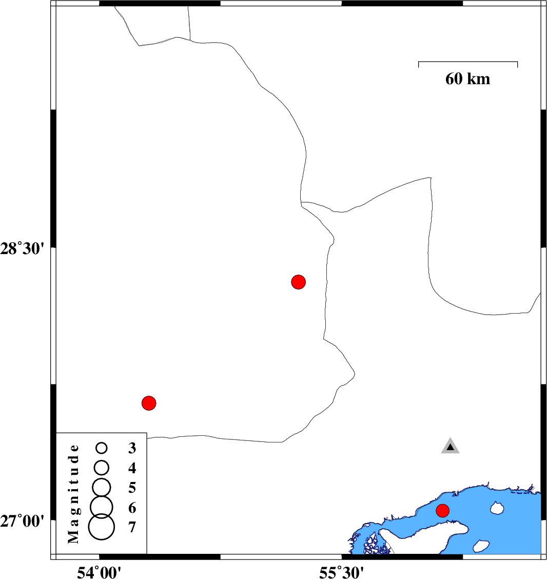 | 2025/01/30 | 23:33:03.1 | 03:03:03.1 | 27.229 | 54.225 | 7 | ML3.2 | Hormozgan Province, 14 km -West of Bastak | ||