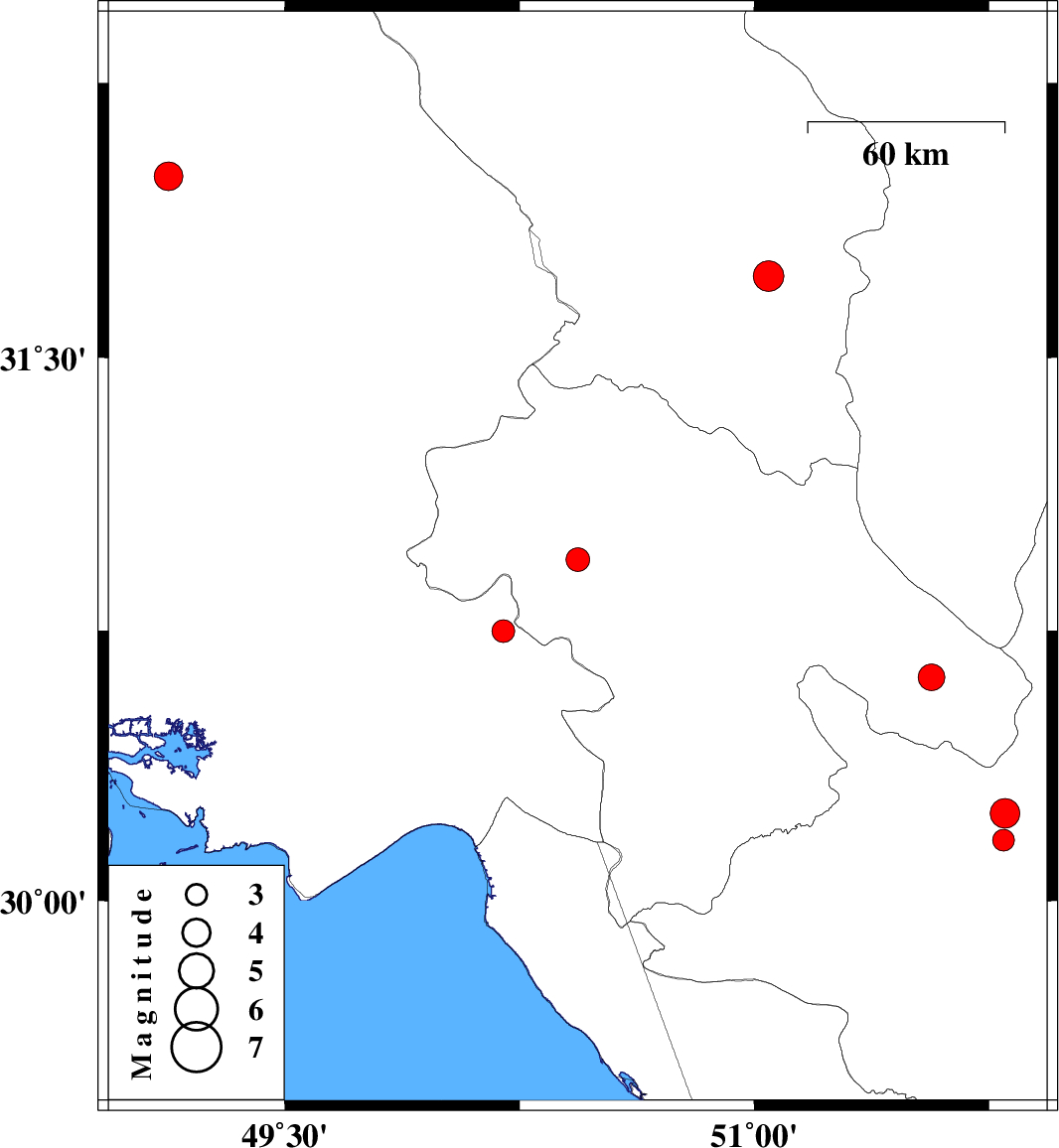 | 2025/04/03 | 04:11:34.2 | 07:41:34.2 | 30.748 | 50.198 | 12 | ML3.2 | Khoozestan Province, 17 km North of Behbahan | ||