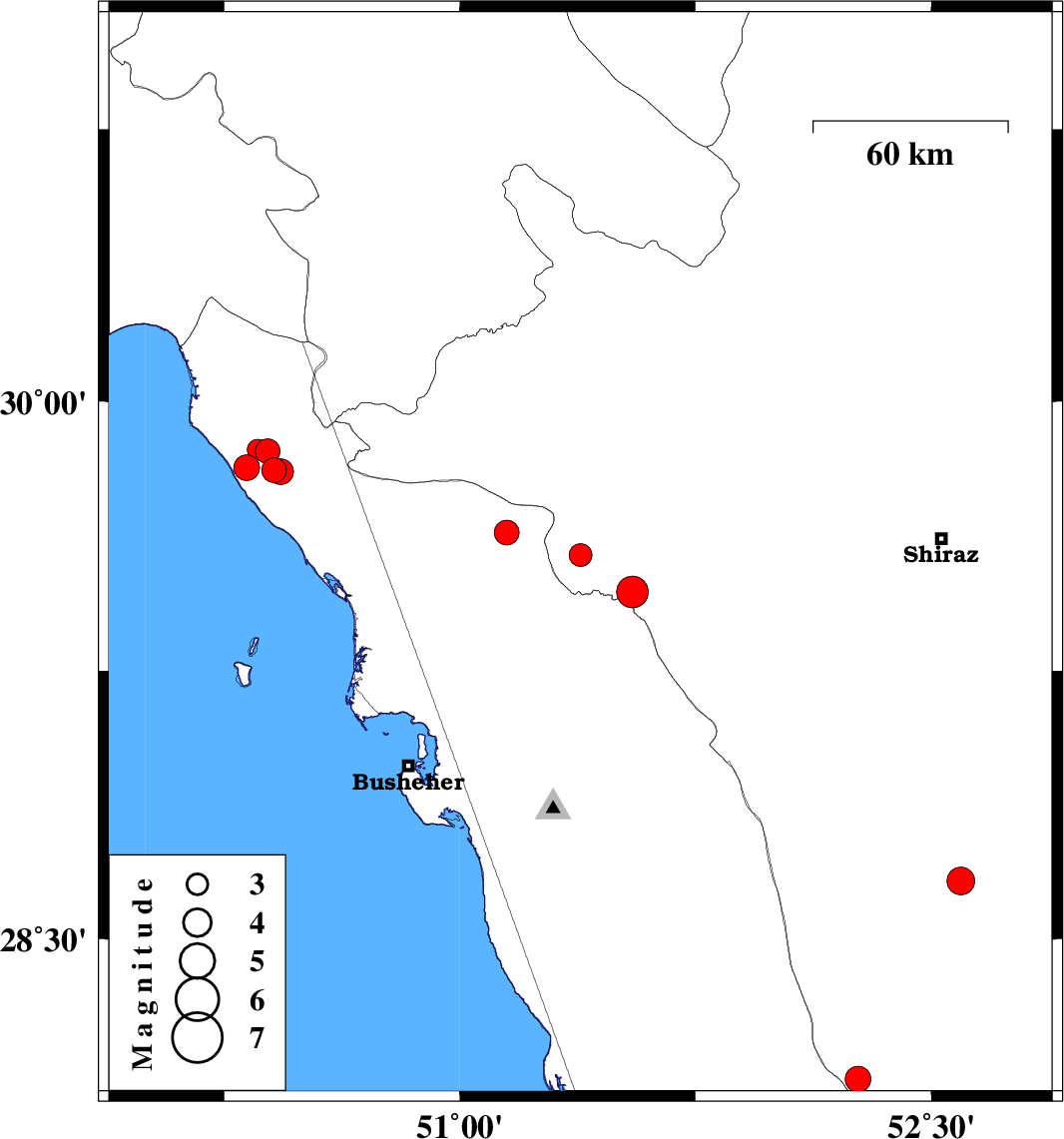 | 2025/03/14 | 13:14:06.4 | 16:44:06.4 | 29.635 | 51.15 | 12 | ML3.5 | Bushehr Province, 42 km North of Borazjan | ||