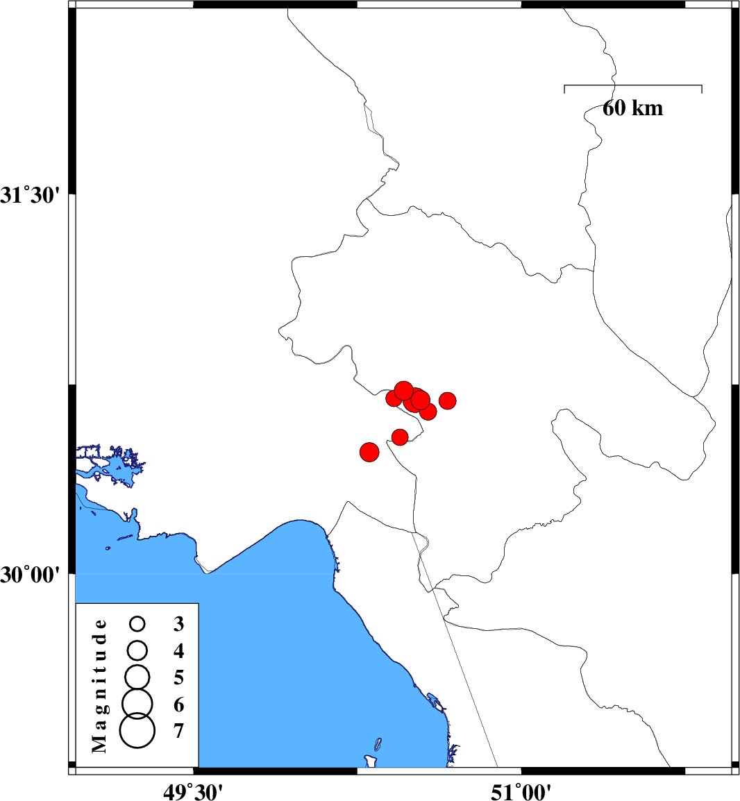 | 2025/05/27 | 14:31:54.5 | 18:01:54.5 | 30.541 | 50.444 | 12 | ML3.4 | Khoozestan Province, 20 km -East of Behbahan | ||