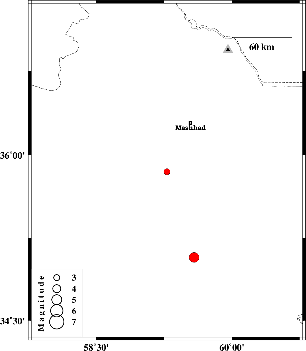 | 2025/05/01 | 01:40:33.6 | 05:10:33.6 | 35.075 | 59.583 | 15 | ML5 | Khorasan(center) Province, 40 km South-East of Torbat-e heydariyeh |