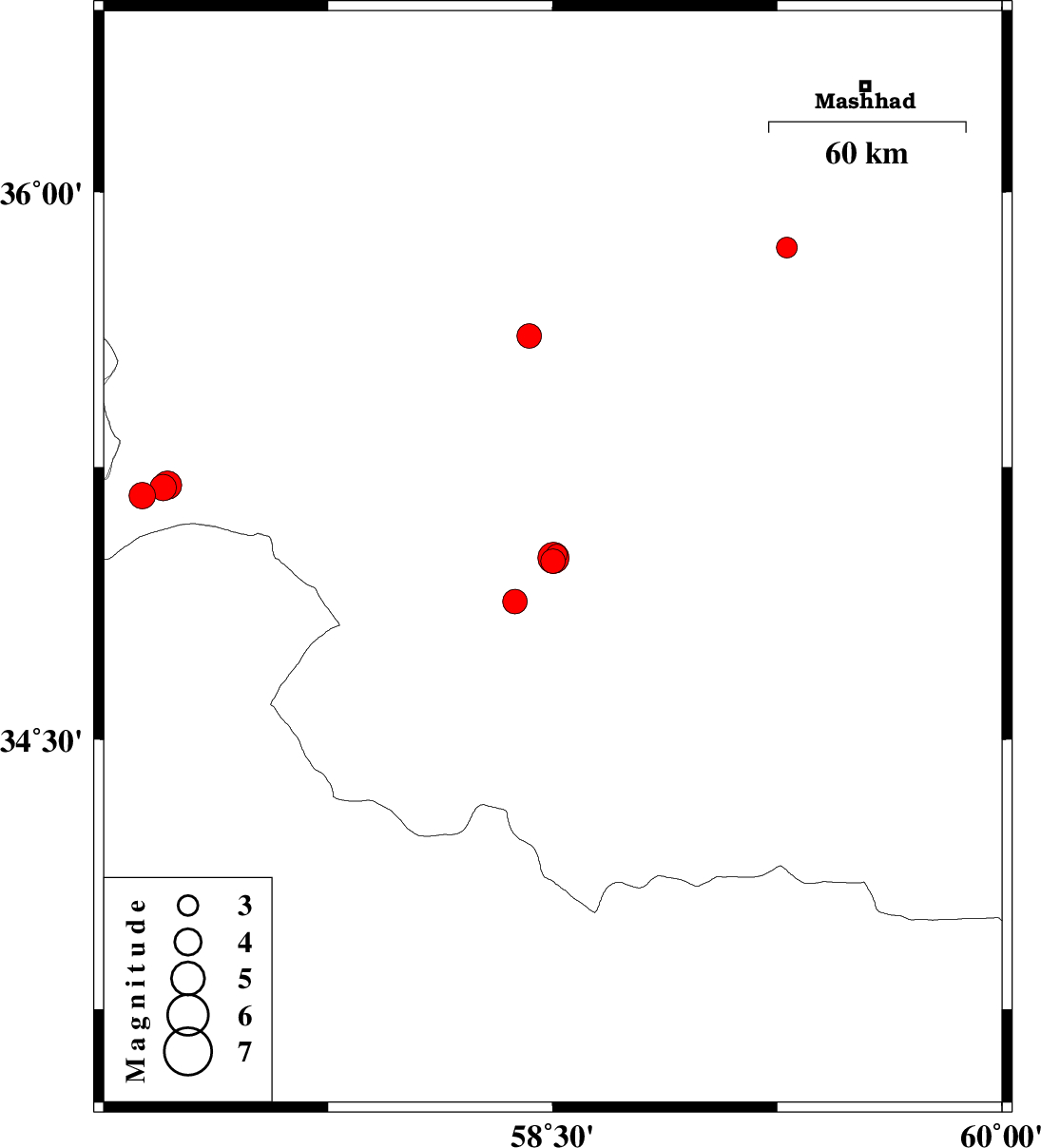 | 2025/06/07 | 03:02:21.2 | 06:32:21.2 | 34.88 | 58.374 | 15 | ML3.6 | Khorasan(center) Province, 40 km South of Kashmar | ||