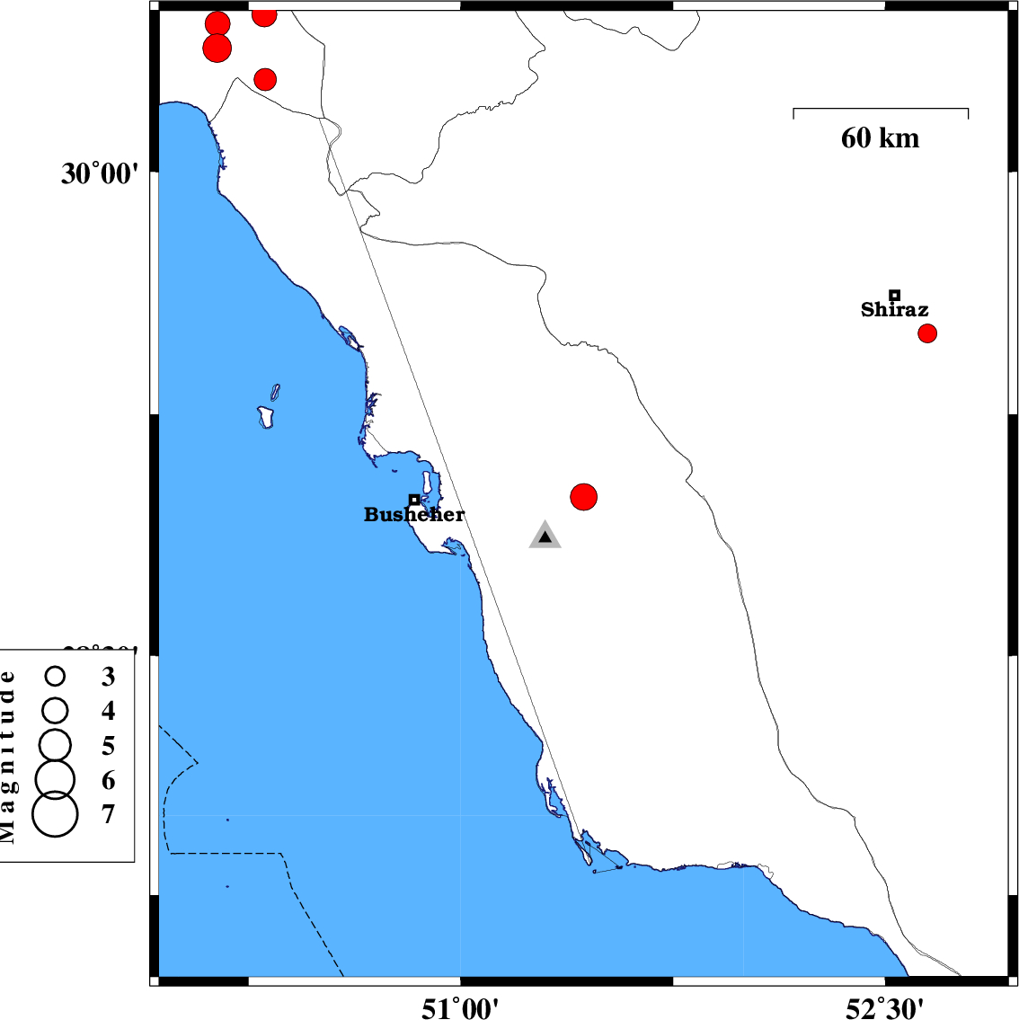 | 2025/06/17 | 15:25:38.0 | 18:55:38.0 | 28.994 | 51.434 | 12 | ML4.2 | Bushehr Province, 21 km North-East of Ahram | ||