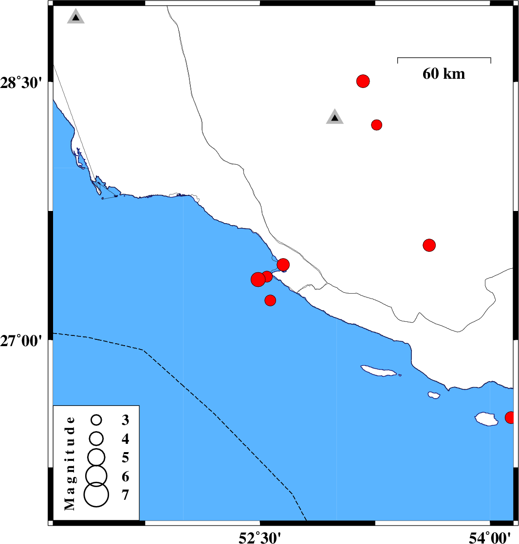 2025/09/15 | 21:03:21.7 | 00:33:21.7 | 27.352 | 52.486 | 12 | ML4.2 | Persian Gulf, 45 km South-West of Mehr | ||