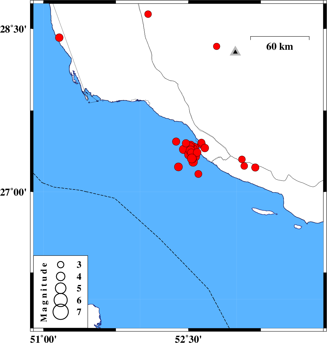 2025/07/28 | 03:54:30.9 | 07:24:30.9 | 27.357 | 52.533 | 12 | ML:4.7 | Persian Gulf, 41 km South-West of Mehr | ||