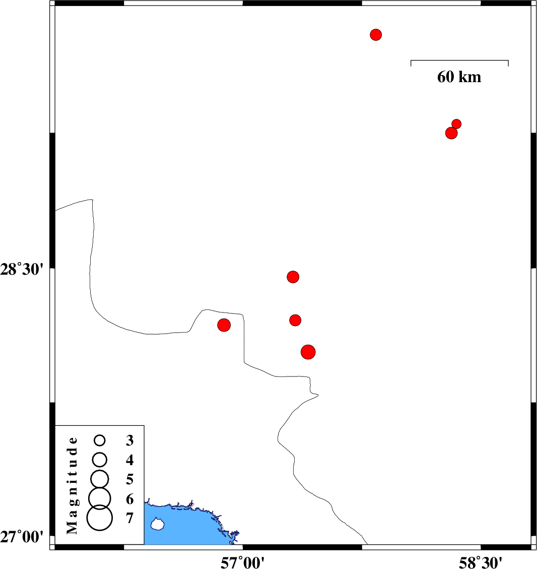 2025/09/12 | 06:51:42.1 | 10:21:42.1 | 28.209 | 57.33 | 12 | ML3.2 | Kerman Province, 46 km North-West of Kahnuj | ||